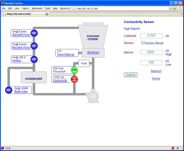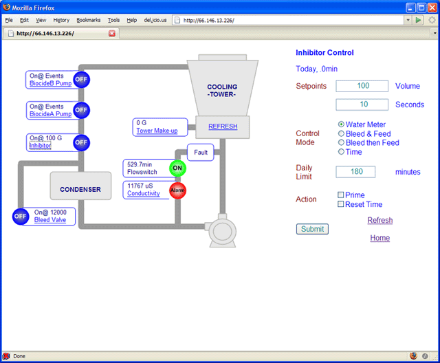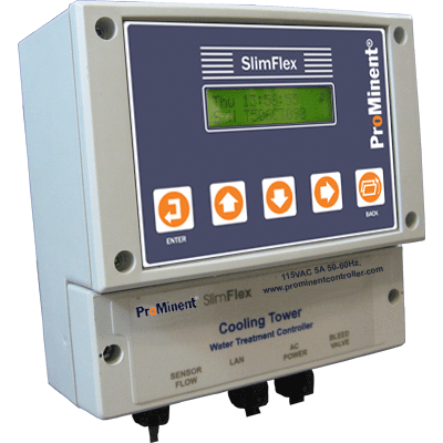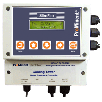 User Manual for SlimFlex Cooling Tower controller Part Number: CO-IN-TB-TB (with CTF Sensor). Measures Conductivity, Temperature, Make-up Water Meter and Flowswitch Controls the Bleed Solenoid, Inhibitor and two Biocide Pumps. Includes CTF, Conductivity-Temperature-Flowswitch Sensor. Discusses Installation, Start-Up, Operation, and Maintenance